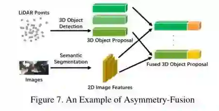 除了早融合、深度融合和后融合之外,还有一些方法会对不同的分支赋予不同的特权,因此我们将融合来自一个分支的对象级信息,而来自其他分支的数据级或功能级信息的方法定义为不对称融合。与其他强融合方法看似平等地对待两个分支不同,不对称融合方法至少有一个分支占主导地位,其他分支只是提供辅助信息来完成最后的任务。下图就是一个经典的例子。与后期融合相比,虽然它们提取特征的过程是相似的,但不对称融合只有来自一个分支的一个提议,而后融合会融合所有的分支信息。 非对称融合 很显然这类型的融合方法也是合理的,因为卷积神经网络对摄像机数据具有良好的性能,它可以有效的过滤出在点云数据中没有实际语义信息的无用点,在融合的时候就可以一定程度上避免噪声点的干扰。不仅如此,还有一些作品尝试跳出常规,使用激光雷达骨干来指导2D多视角的数据进行融合,通过信息的交互指导实现更高的准确度。