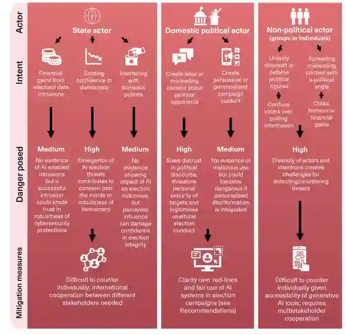 竞选威胁:旨在操纵选民对特定政治候选人或政治问题特定观点的行为或态度。其中一些威胁可能来自敌对行为者,而另一些威胁则来自政党本身--这表明有必要对竞选期间公平使用人工智能提供更明确的指导和限制。