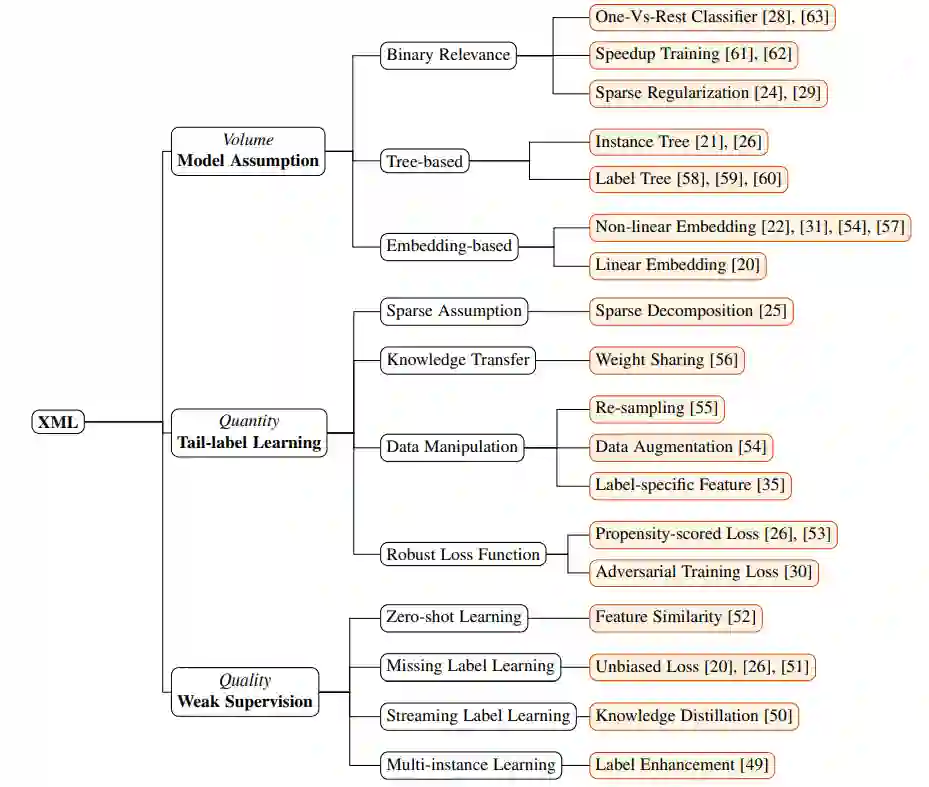 **据我们所知,这是第一次与XML相关的先驱综述。本次调研的贡献可以概括为:**1)综合综述。我们将全面回顾XML,包括核心挑战及其相应的解决方案。2)新分类法。我们提出了一种XML分类法,它从三个不同的角度对现有的XML方法进行了分类:1)模型体系结构; 2) 尾标签学习; 3) 弱监督XML。3) 资源丰富。我们收集了大量关于XML的资源,包括XML方法的开源实现、数据集、工具和纸列表。4)未来的发展方向。我们讨论并分析了现有XML方法的局限性。并提出了未来可能的研究方向。