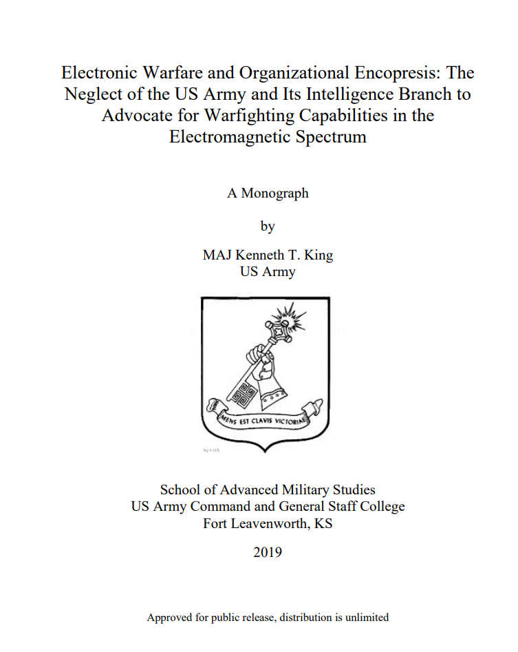 本专著将试图解释情报部门如何由于内部偏见以及陆军如何由于体制上的无知而忽视了国家的电子战能力。作为 "积极防御 "条令的一部分,陆军在 20 世纪 70 年代重点关注电子战。尽管作战概念发生了变化,电子战技术也在不断进步,但情报部门仍然坚持了这一重点。不过,在某些情况下,情报部门利用电子战的名称来争取资金支持,而实际上并未将电子战置于与信号情报(SIGINT)等其他学科同等的地位。全球反恐战争重塑了在反叛乱行动中使用电子战的观念。这些事件将陆军的重点从特定的预警平台上转移开来。该部门无法为电子战提供可行的途径,于是将这一学科让给了消防部门。