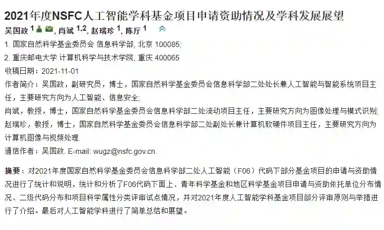 摘要:对2021年度国家自然科学基金委员会信息科学部二处人工智能(F06)代码下部分基金项目的申请与资助情况进行了统计和说明,统计和分析了F06代码下面上、青年科学基金和地区科学基金项目申请与资助依托单位分布情况、二级代码分布和项目科学属性分类评审试点情况,并对2021年度人工智能学科基金项目部分评审原则与举措进行了介绍。最后对人工智能学科进行了简单总结和展望。