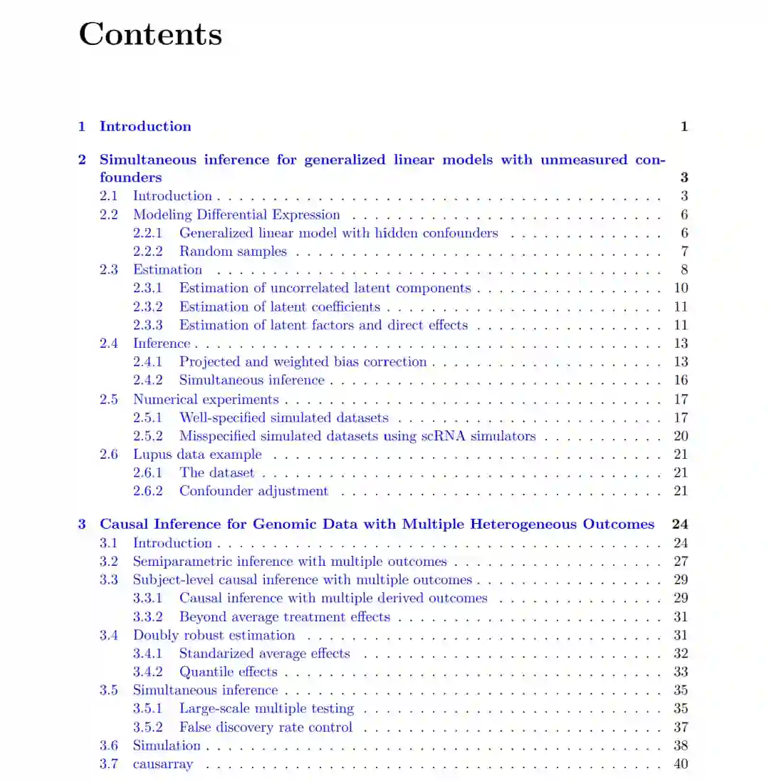 在基因组研究中,通常会进行成千上万次的统计假设检验,以识别与疾病相关的因果基因。最近,单细胞RNA测序和CRISPR技术的进展使得基因表达能够以高分辨率进行测量。然而,这些数据通常是稀疏的、过度离散的且具有异质性,这为多个因果效应的可靠推断带来了重大挑战。本论文提出了三种互补的解决方案: (1) GCATE 是一种统一的基于模型的框架,用于具有潜在混杂因素的广义线性模型。通过利用正交结构和线性投影,GCATE 使得在非线性模型下对直接效应进行一致性估计和推断成为可能。在样本量和响应量都接近无穷大的高维情境下,我们推导出了渐近z检验的I型误差控制,并通过Benjamini-Hochberg方法在经验上演示了假发现率(FDR)的控制。通过比较来自两组样本的单细胞RNA测序计数,我们展示了在模型中缺乏显著协变量时,调整混杂效应的适用性。
