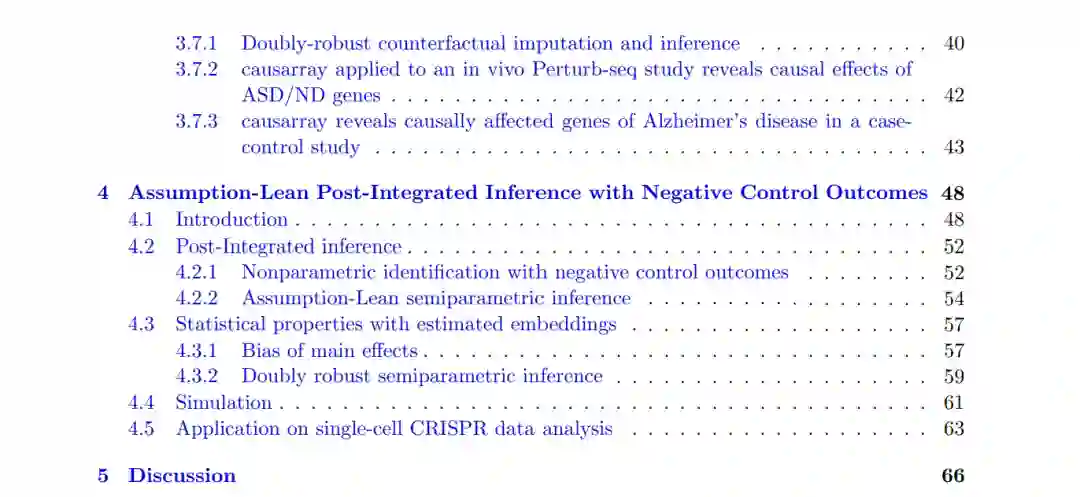 (2) causarray 将GCATE中的混杂因素估计与多重衍生结果的半参数框架结合起来。该方法不仅扩展了平均处理效应,还能够提供稳健的因果估计,并允许使用机器学习进行灵活估计,所得到的双重稳健管道保持假发现率(FDR)或假发现扩展(FDX)控制。应用于自闭症风险基因的体内Perturb-seq筛选和三种阿尔茨海默病转录组数据集,揭示了与疾病相关的神经通路聚类。 (3) Pii 利用负控制结果调整潜在的异质性,提供假设最小的后集成推断。所得到的双重稳健估计量在弱条件下实现了一致性和效率,使得在与机器学习数据自适应估计集成后能够进行推断。通过随机森林的模拟评估了经验性能,并进一步在具有潜在未测量混杂因素的单细胞CRISPR数据集上进行演示。 这三种方法共同形成了一套系统的因果推断工具,能够应对非高斯性、异质性、高维性和未测量的混杂问题,并支持可靠地发现与疾病相关的基因和通路。