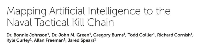 在海军研究使用人工智能方法的过程中,杀伤链是另一个备受关注的主要应用。概念性研究提出将人工智能用作认知助手和人机协作(Iversen和DiVita,2019年;Ding等人,2022年;Johnson 2019年;Grooms,2019年;Albarado等人,2022年)。使用人工智能从多个来源的数据融合中提取知识和作战环境的情况意识的研究正在成熟(Zhao等人,2018)。