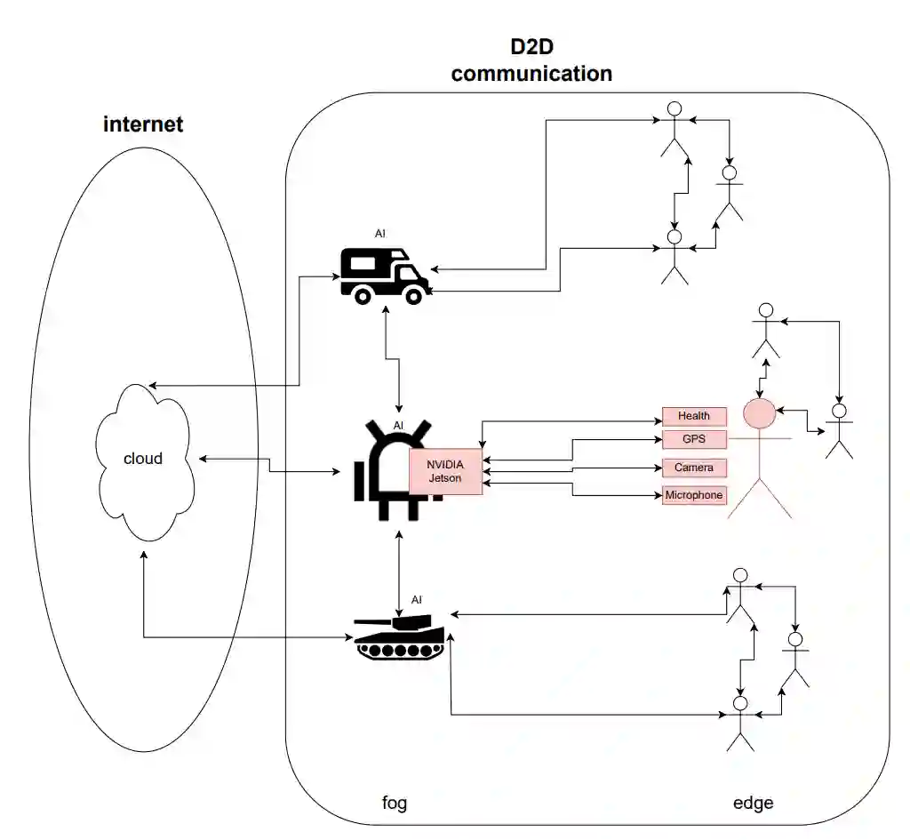 士兵通常会使用多种物联网设备,如健康传感器、GPS、摄像头、麦克风等。这些物联网设备功能太弱,无法处理复杂的人工智能任务,如基于深度学习(DL)流程的任务。如果能将这些设备的数据发送到军用车辆或机器人(如移动平台),让其利用足够的能源和计算能力执行人工智能任务,就能更轻松地满足所面临的要求。然后,可将结果反馈给全球战场性能分析评估人员、士兵和云数据中心。移动雾人工智能是一种创新方法,由专门用于人工智能任务的移动雾层组成,该层扩展了 D2D/P2P 网络,利用雾计算作为支持人工智能功能的服务。为此,雾人工智能主要利用边缘计算/人工智能来简化数据,因为假设 D2D 只处理少量数据(Bellavista 等人,2019 年)。