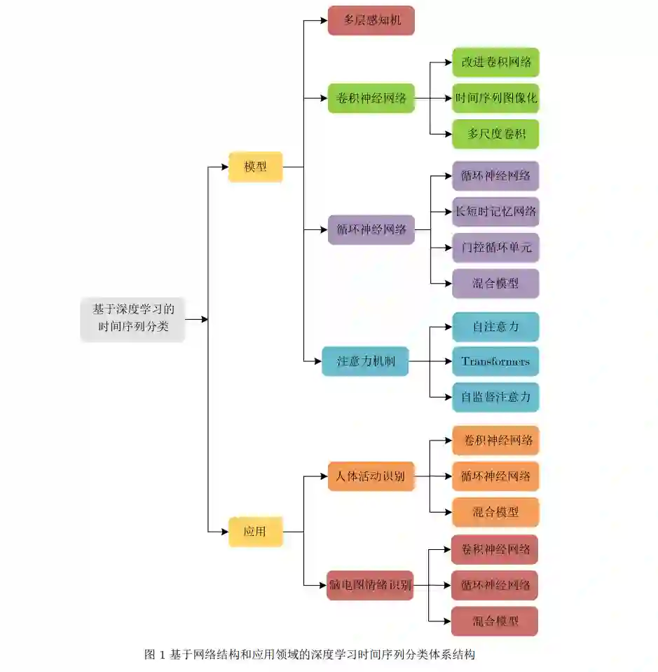 时间序列分析被认为是21世纪数据挖掘领域的 十大挑战性研究问题之一[1]。时间序列分类(Time Series Classification, TSC)是时间序列分析中的关 键任务之一[2]。TSC旨在构建一个机器学习模型, 用于预测连续有序的实值观测序列的类别标签。 TSC具有广泛的应用,如人体活动识别(Human Activity Recognition, HAR)[3,4]、基于电子健康记 录的诊断[5]以及系统监测[6]等。此外,作为时间序 列基准数据集的加利福尼亚大学河滨分校时间序列 数据集[7] (University of California Riverside, UCR) 和东英吉利大学时间序列数据集[8] (University of East Anglia, UEA)包含类型的多样性,也充分说 明了TSC的广泛应用领域。 近年,深度学习在计算机视觉和自然语言处理 领域取得了巨大的成功。相对于传统的机器学习方 法,深度学习能够自动地从原始数据的低级属性中学习并抽取更高层次的有意义性特征。因此,深度 学习在TSC领域也逐渐受到关注,更有学者认为深 度学习对于视觉和语音等领域的影响会在TSC研究 领域中得以复制。文献[9]讨论了亚历克斯网络(Alex Krizhevsky Network AlexNet)对计算机视觉的影 响,并指出鉴于数据的相似性,深度学习在TSC领 域有巨大的改进潜力。文献[10]是最早发表的基于 深度学习的TSC综述之一,具有很大的影响力。作 者将TSC分为生成模型和判别模型两大类,通过实 验验证了这两大类中当前最先进性能的模型,结果 显示判别模型中残差网络(Residual Network, ResNet)[11]是最准确的TSC深度学习模型。随后, 同一研究团队提出了时间序列分类集成深度卷积神 经网络(InceptionTime)[9],该方法的性能优于之前 综述中表现最佳的ResNet。自从InceptionTime之 后,已有大量深度学习论文提出了TSC算法,其中 大多数发表在最近3年。特别是,近年来备受关注 且在时间序列数据中显示出色的短程和长程依赖关 系建模能力的注意力模型,这些模型非常适用于时 间序列建模[12,13]。许多注意力的变体模型已被提出, 以解决时间序列建模中的特定挑战,并成功应用于 时间序列分类[14,15]。鉴于注意力机制和时间序列分 类的新网络结构的出现,本综述旨在提供关于最新 方法的介绍,以对时间序列分类领域的深度学习最 新研究进行系统和全面的总结。特别是,本文将对 尚未在文献[10]中进行系统综述的基于深度学习的 TSC方法进行介绍,这将有益于时间序列分析社区 的发展。 本文首先定义并简要介绍了时间序列分类任务, 随后概述了经典的非深度学习时间序列分类方法。 接下来,从网络架构和应用领域两个角度提出了一 个用于TSC的新分类法,并总结了基于多层感知器、 基于卷积神经网络、基于循环神经网络和基于注意 力的TSC模型架构,以及用于提高性能的改进方 法。然后,总结了TSC在人体活动识别领域的研究 现状。最后,探讨了深度学习时间序列分类任务中 尚未解决的问题并展望了未来的研究方向。