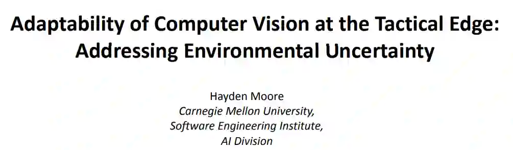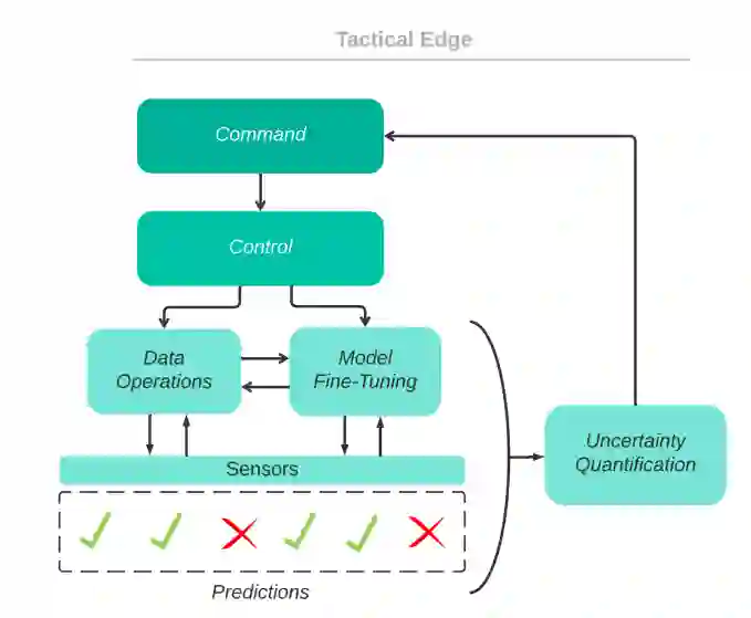 指挥与控制 (C2) 系统越来越多地采用计算机视觉 (CV) 系统来改进战场上的情报分析,即战术边缘。CV 系统利用人工智能 (AI) 算法来帮助可视化和解释环境,从而提高态势感知能力。然而,由于环境和目标瞬息万变,部署的模型可能会被混淆,因此 CV 系统在战术边缘的适应性仍面临挑战。由于环境和环境中存在的物体开始发生变化,在这种环境中使用的 CV 模型在预测时可能会变得不确定。此外,任务目标的快速变化也会导致技术、摄像机角度和图像分辨率的调整。所有这些都会对系统的性能产生负面影响,并可能给系统带来不确定性。当训练环境和/或技术与部署环境不同时,CV 模型的表现可能会出乎意料。遗憾的是,大多数战术边缘场景并未将不确定性量化(UQ)纳入其部署的 C2 和 CV 系统。本概念文件探讨了在战术边缘同步进行由 UQ 驱动的稳健数据操作和模型微调的想法。具体来说,根据预测的残差整理数据集和训练子模型,使用这些子模型计算预测区间(PI),然后使用这些 PI 校准部署的模型。通过将 UQ 纳入战术边缘 C2 和 CV 系统的核心操作,我们可以帮助推动战场上有目的的适应性。