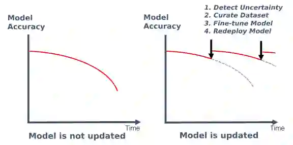 通过使用 UQ,作战人员可以更准确地衡量其 CV 模型的失败之处,然后开始整理必要的数据并对模型进行微调。下图 1 显示了定义明确的类别的数据如何随着时间的推移而开始变化和退化。这直接影响到部署在战术边缘的模型预测的可信度。本文建议作战人员在其核心 CV 操作中建立 UQ。作战人员应积极测量已部署模型的不确定性,整理相关数据集,微调这些模型,然后将这些新模型重新部署到战术边缘。
