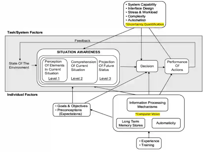 图 2 - 修改后的态势感知模型;描述战场上如何衡量、操作和使用态势感知进行决策。经过修改,明确描述了 CV 和 UQ [10] 。