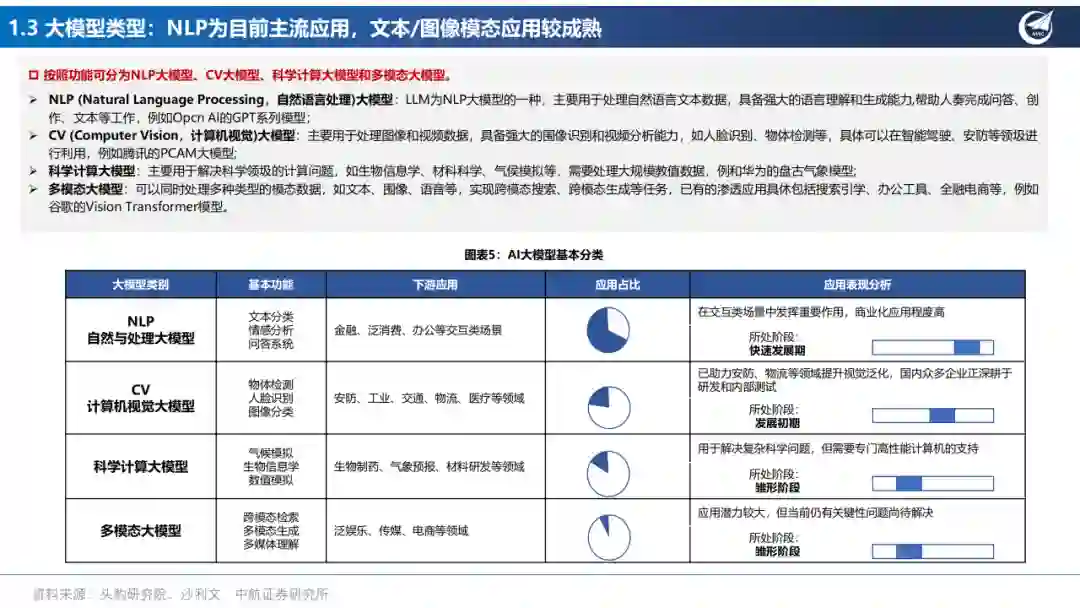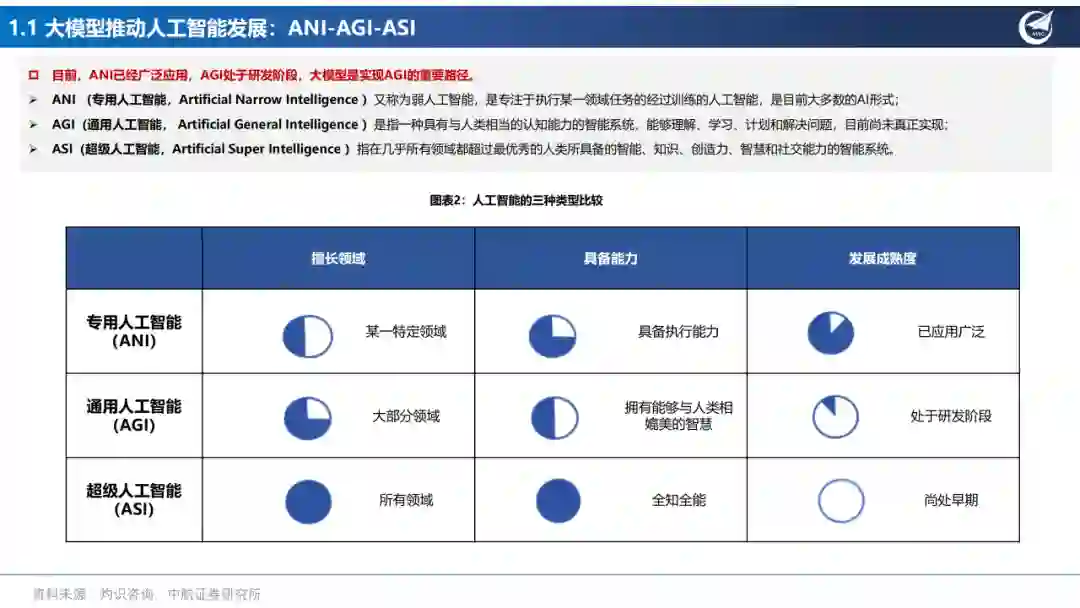 大模型演进:工业革命级的生产力工具。目前,ANI已经广泛应用,AGI处于研发阶段,大模型是实现AGI的重要路径。AI大模型通过预先在海量数据上进行大规模训练,而后能通过微调以适应一系列下游任务的通用人工智能模型。在“大数据+大算力+强算法”的加持下,进一步通过“提示+指令微调+人类反馈”方式,实现一个模型应用在很多不同领域。人工智能的发展已经从“大炼模型”逐步迈向了“炼大模型”的阶段,逐渐掀起多模态和多场景革命,重塑AI技术范式,提升模型能力天花板,应用价值显著提升。大模型现状:GPT引领,百模征战。(1)ChatGPT加速迭代:从GPT-1至GPT3.5跨越4年多时间,ChatGPT发布仅一年,GPT迭代开启“加速度”,现已具备多模态能力,并搭建GPTs生态,将定制化模型从ToB推广到ToC,低门槛、低成本、定制化的特点,使得GPTs具备普及性和颠覆性。(2)他山之石:据业界不完全统计,23H1硅谷在人工智能领域共完成了42起融资,总金额约140亿美元(占世界总融资金额的55%),应用方面的投资金额仅次于大模型,垂类场景应用的融资中对话机器人占据绝对优势。(3)国内大模型:科技型企业包括人工智能企业、垂直大模型企业和数据智能服务商相继进场,如商汤科技、度小满和滴普科技等企业,以百度、腾讯和阿里为代表的互联网云厂商占据中国通用大模型行业多数市场份额,在布局时间、基础设施建设、应用场景等方面具备明显优势。(4)爆款应用:基于ChatGPT的火爆和大模型的迭代发展,海内外AI在对话、图像、教育、办公等多个领域出现爆款应用。大模型未来:应用多点开花,产业智能跃迁。(1)内容变革:拥有通用性、基础性多模态、参数多、训练数据量大、生成内容高质稳定等特征的AI大模型成为了自动化内容生产的“工厂”和“流水线”,随着 GPTstore 的出现, AI 大模型将迎来自己的“APP Store”时代,AIGC 商业应用的前景愈发广阔。(2)模型演绎:多模态模型核心目标是模拟人类大脑处理信息的方式,以更全面、综合的方式理解和生成信息,底层通用大模型目前成为最受关注、建设和提升迫切性最强的领域,中间层模型国内目前尚未出现相关玩家。(3)AIGC主流的营收模式可分为四种:MaaS、按产出内容量付费、软件订阅付费、模型定制开发费。目前,按照产出量收费的模式占据主流,但随着底层模型即AIGC生态的建立,最具长期增长潜力并将占据主要市场规模的为MaaS模式。据量子位预测,2023年AIGC不同商业模式规模约170亿元,预期2026将翻一番,2030年有望突破万亿市场规模。