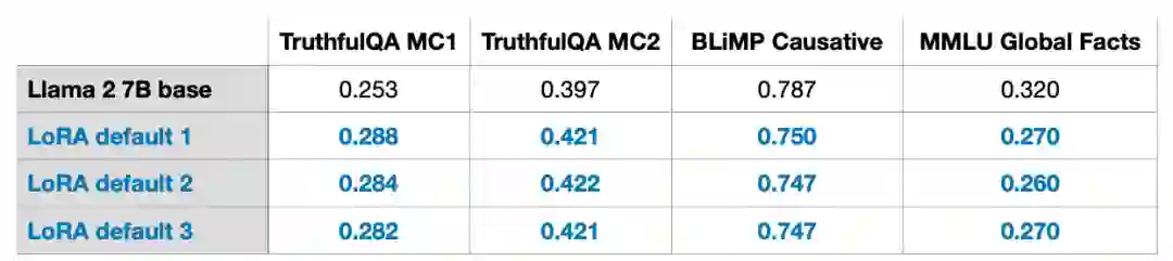 虽然 LLM,或者说在 GPU 上被训练的模型的随机性不可避免,但是采用 LoRA 进行多次实验,LLM 最终的基准结果在不同测试集中都表现出了惊人的一致性。对于进行其他比较研究,这是一个很好的基础。
