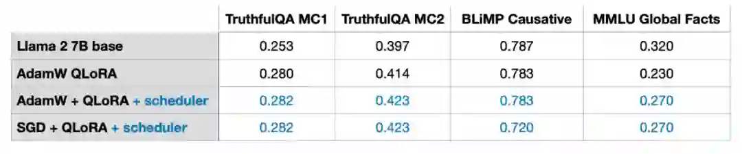 在实验中,我在 LoRA 微调脚本中添加了一个余弦退火调度器,它显著地提高了 SGD 的性能。但是它对 Adam 和 AdamW 优化器的增益较小,添加之后几乎没有什么变化。