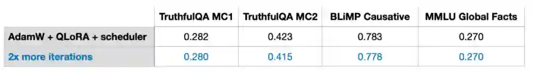 因此,我得出的结论是,多轮迭代可能不利于指令微调。我在 1k 的示例 LIMA 指令微调集中也观察到了同样的状况。模型性能的下降可能是由过拟合造成的,具体原因仍需进一步探索。 在更多层中使用 LoRA