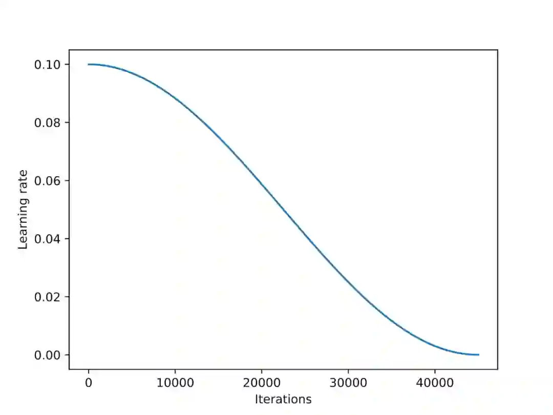 学习率调度器会在整个训练过程中降低学习率,从而优化模型的收敛程度,避免 loss 值过大。 余弦退火(Cosine annealing)是一种遵循余弦曲线调整学习率的调度器。它以较高的学习率作为起点,然后平滑下降,以类似余弦的模式逐渐接近 0。一种常见的余弦退火变体是半周期变体,在训练过程中只完成半个余弦周期,如下图所示。