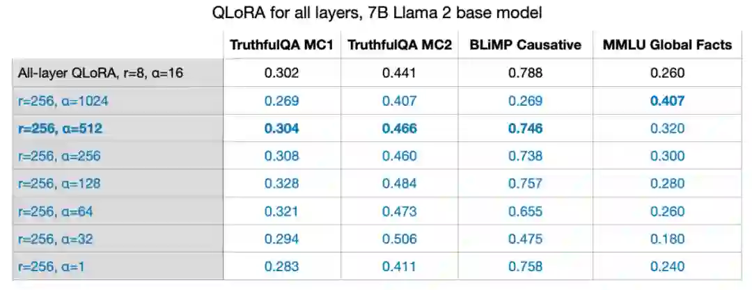 对于这个问题,目前我还没有比较好的解决方法。最佳 r 值的确定,需要根据每个 LLM 和每个数据集的具体情况,具体问题具体分析。我推测 r 值过大将导致过拟和,而 r 值过小,模型可能无法捕捉数据集中多样化的任务。我怀疑数据集中的任务类型越多,所需 r 值就越大。例如,如果我仅需要模型执行基本的两位数算术运算,那么一个很小的 r 值可能就已经满足需要了。然而,这只是我的假设,需要进一步的研究来验证。 Q4:LoRA 是否需要为所有层启用?
