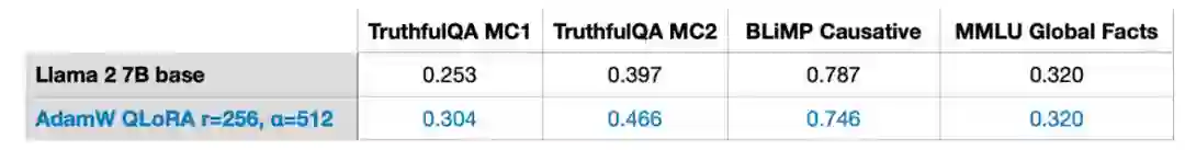 数据集至关重要。我使用的是包含 50k 训练示例的 Alpaca 数据集。我选择 Alpaca 是因为它非常流行。由于本文篇幅已经很长,所以在更多数据集上的测试结果本文暂不讨论。 Alpaca 是一个合成数据集,按照如今的标准,它可以已经有点落伍了。数据质量非常关键。例如,在六月份,我在一篇文章中讨论了 LIMA 数据集,这是一个仅由一千个示例组成的精选数据集。 文章链接:https://magazine.sebastianraschka.com/p/ahead-of-ai-9-llm-tuning-and-dataset 正如提出 LIMA 的论文的标题所说:对于对齐来说,少即是多,虽然 LIMA 的数据量少于 Alpaca,但根据 LIMA 微调出的 65B Llama 模型优于 Alpaca 的结果。采用同样的配置 (r=256, alpha=512) ,在 LIMA 上,我获得了与数据量级是其 50 倍大的 Alpaca 类似的模型表现。 Q2:LoRA 是否适用于域自适应?