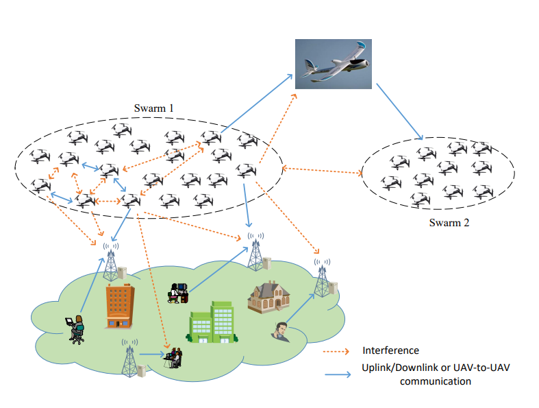 有用的 UAV 到 UAV 通信:最后但同样重要的是,类似于地面设备到设备 (D2D) 通信,UAV 到 UAV 通信可以广泛用于群内空中无线网络中,用于数据传输、中继、自主飞行、聚集等[5]。因此,它将带来能源效率、频谱效率和扩大空中覆盖范围的好处。此外,可以减轻回程链路的负担,从而降低传输延迟。