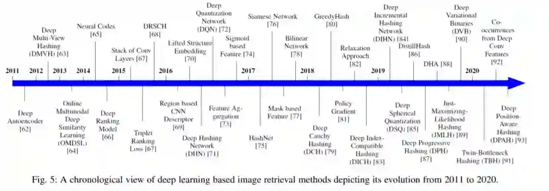 与[47]、[28]、[48]最近的综述不同,本综述论文特别涵盖了2011-2020十年中使用深度学习技术进行图像检索的进展。此外,与最近的综述[49]相比,我们提供了一个非常有用的分类(见图4),广泛覆盖了现有的基于深度学习的图像检索方法。