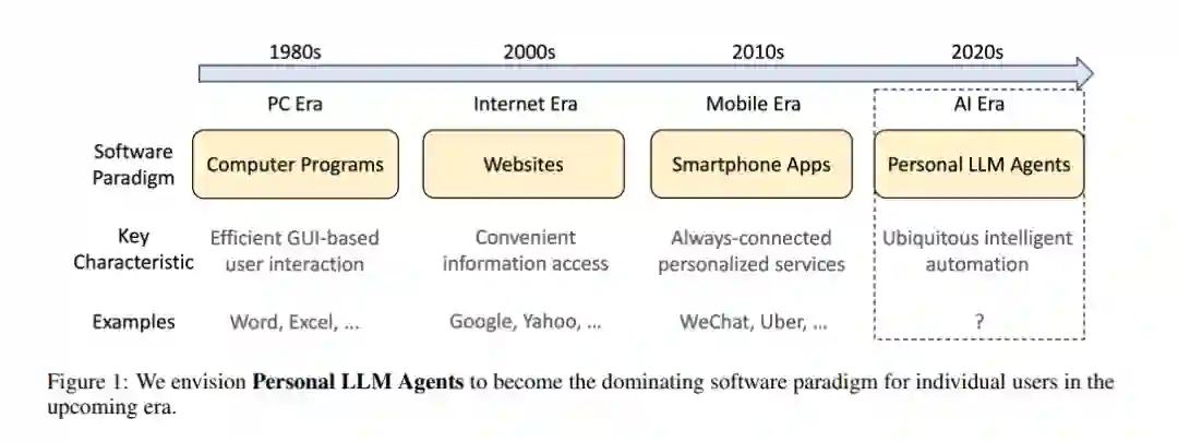 近年来,大型语言模型(LLMs)[7]的出现为IPAs的发展带来了全新的机遇,展示了解决智能个人助理可扩展性问题的潜力。与传统方法相比,如ChatGPT、Claude等大型语言模型展示了独特的能力,如指令遵循、常识推理和零样本泛化。这些能力是通过在庞大的语料库(超过1.4万亿词)上进行无监督学习并随后通过人类反馈进行微调来实现的。利用这些能力,研究人员已经成功地采用大型语言模型来赋能自主智能体(即LLM智能体),旨在通过自动制定计划和使用工具(如搜索引擎、代码解释器和第三方API)来解决复杂问题。 作为一种独特类型的智能智能体,IPAs也有可能通过LLMs实现显著提高的可扩展性、能力和实用性。我们称这种由LLM驱动的智能个人助理为个人LLM智能体。与普通LLM智能体相比,个人LLM智能体更深入地参与个人数据和移动设备,并更明确地设计为协助人类而不是取代人类。具体来说,协助用户的主要方式是减少他们日常生活中重复、枯燥和低价值的劳动,让用户专注于更有趣和有价值的事情,从而提高他们工作和生活的效率和质量。个人LLM智能体可以建立在现有的软件堆栈(例如,移动应用、网站等)之上,同时带来无处不在的智能自动化能力的新鲜用户体验。因此,我们期望个人LLM智能体在AI时代成为个人计算设备的主要软件范式,如图1所示。