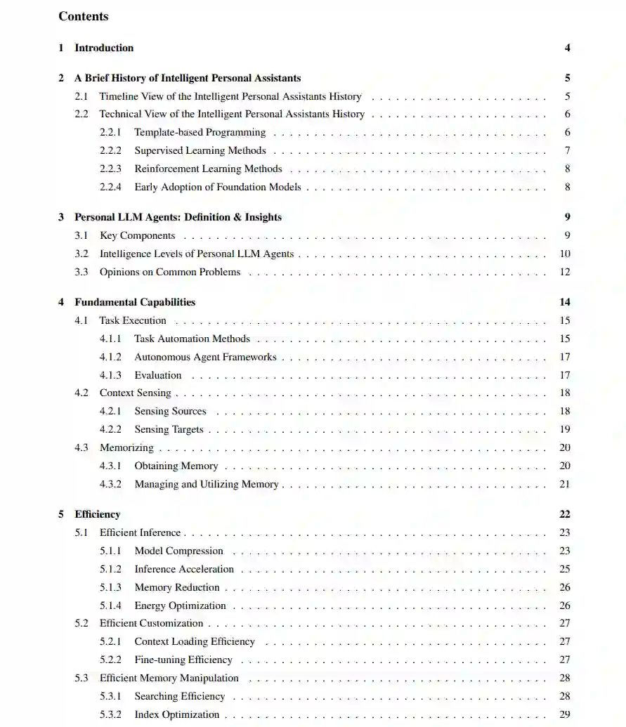尽管个人LLM智能体的未来充满希望,但相关研究仍处于起步阶段,呈现出许多复杂性和挑战。本文首先讨论了实施个人LLM智能体的路线图、设计选择、主要挑战及可能的解决方案。特别是,我们主要关注个人LLM智能体中与“个人”部分相关的方面,包括分析和利用用户的个人数据、使用个人资源、在个人设备上的部署以及提供个性化服务。将LLM的通用语言能力直接整合到IPA中并不在本文的讨论范围内。 我们首先对个人LLM智能体的领域专家进行了调查。我们邀请了25位主要公司的首席架构师、董事总经理和/或高级工程师/研究员,他们正在研究IPAs和/或个人设备上的LLMs。我们询问了这些专家关于在面向消费者的产品中整合LLMs的机会和挑战的看法。基于我们对专家见解的理解和分析,我们总结了一个简单且通用的个人LLM智能体架构,在该架构中,个人数据(用户上下文、环境状态、活动历史、个性等)和个人资源(移动应用、传感器、智能家居设备等)的智能管理和利用起着至关重要的作用。管理和利用这些个人对象的能力区分了个人LLM智能体的智能。受到自动驾驶的L1-L5智能级别的启发,我们还给出了个人LLM智能体的五个智能级别的分类。 我们的发现还突出了实现这种个人LLM智能体的几个主要技术挑战,这些挑战可以分为基本能力、效率以及安全性和隐私性三个方面。我们进一步深入这些方面,详细解释了挑战,并对可能的解决方案进行了全面调查。具体而言,对于每个技术方面,我们简要说明其与个人LLM智能体的相关性和重要性,然后将其分解为几个主要研究问题。例如,个人LLM智能体的基本能力包括任务执行、上下文感知和记忆。智能体的效率主要由LLM推理效率、定制效率和记忆检索效率决定。个人LLM智能体的安全性和隐私问题可以归类为数据保密性、决策可靠性和系统完整性。对于每个研究问题,我们总结了与该问题相关的主要技术,并简要介绍了相关工作。由于个人LLM智能体技术的范围很广,我们只包括了最相关或最近的工作,而不是试图涵盖所有相关方法。