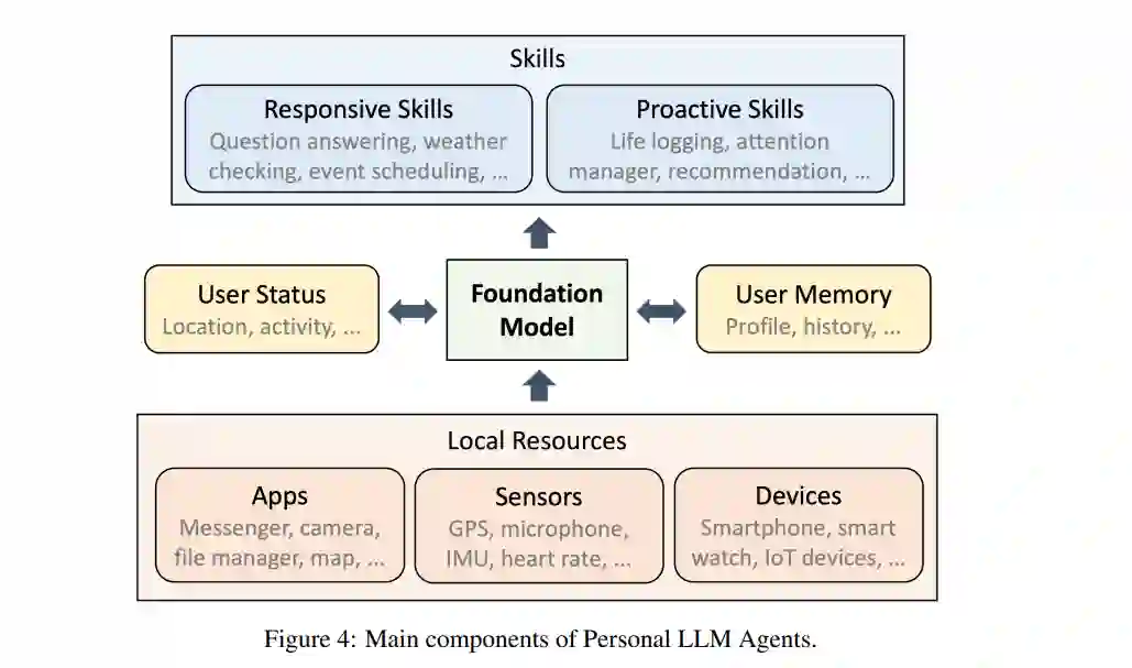 基于我们对个人LLM智能体所需特性的讨论,我们首先总结了支持这些特性的主要组件,如图4所示。 毫无疑问,个人LLM智能体的核心是一个基础模型(大型语言模型或其他变体,为简单起见,我们称之为LLM),它连接了所有其他组件。首先,LLM是支持为用户服务的不同技能的基础,包括直接执行用户请求的响应技能(如问答、天气检查、事件安排等)和在没有明确用户命令的情况下提供服务的主动技能(如生活记录、管理用户注意力、活动推荐等)。