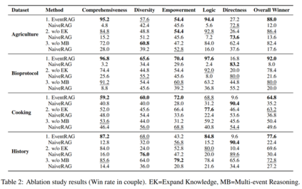 消融实验进一步揭示了事件知识图谱和多事件推理在EventRAG中的核心作用。移除知识扩展功能会导致生成内容的综合性和多样性显著下降,而禁用多事件推理则削弱了逻辑性和整体表现。
