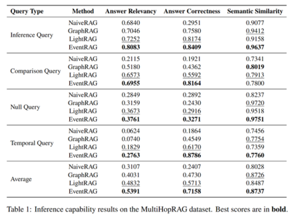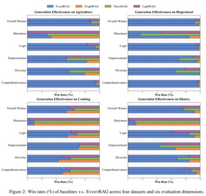 EventRAG在多个基准测试中的表现令人瞩目。在UltraDomain数据集(涵盖农业、烹饪、历史和生物实验领域)上,EventRAG在综合性、逻辑性和整体表现等关键指标上均显著优于基线模型,如NaiveRAG、GraphRAG和LightRAG。尤其在逻辑性方面,EventRAG通过事件知识图谱有效维护了事件关系的一致性,生成内容在叙事连贯性和事件描述的丰富性上表现出色。