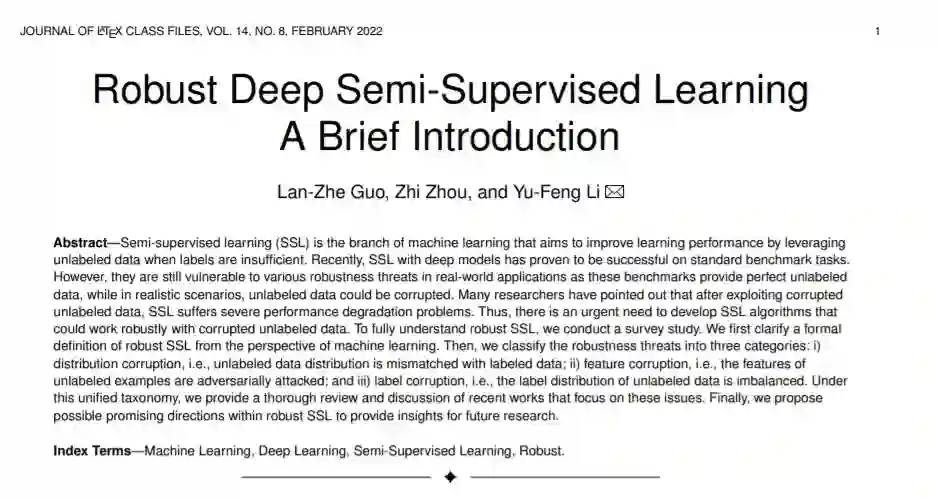 半监督学习(Semi-supervised learning, SSL)是机器学习的一个分支,其目的是在标签不足的情况下利用未标记的数据来提高学习性能。最近,具有深度模型的SSL已被证明在标准基准测试任务上是成功的。然而,在现实应用中,它们仍然容易受到各种健壮性威胁,因为这些基准提供了完美的无标签数据,而在现实场景中,无标签数据可能被破坏。许多研究人员指出,在利用被破坏的未标记数据后,SSL会遭受严重的性能退化问题。因此,迫切需要研发SSL算法,能够稳健地处理损坏的未标记数据。为了充分理解健壮的SSL,我们进行了一项调查研究。我们首先从机器学习的角度阐明了健壮SSL的正式定义。然后,我们将鲁棒性威胁分为三类: i) 分布损坏,即未标记数据分布与标记数据不匹配; ii) 特征损坏,即未标记例子的特征被敌方攻击; iii) 标签损坏,即未标签数据的标签分布不均衡。在这个统一的分类下,我们提供了一个全面的综述和讨论最近的工作,重点关注这些问题。最后,我们提出了在健壮SSL中可能的有前途的方向,为未来的研究提供了见解。