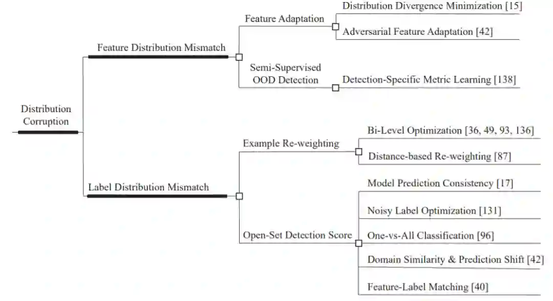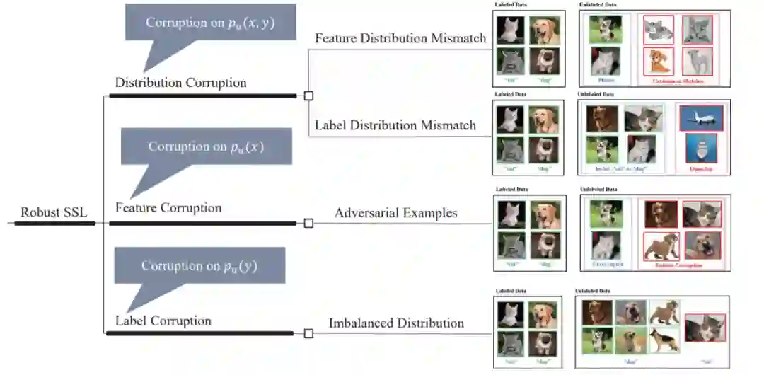 上述所有积极的结果都是基于一个条件,即无标签数据是完美的,允许SSL利用它来提高性能。无标记数据的完善在于两个方面: 首先,对于有标记数据和无标记数据之间的关系,SSL意味着有标记数据集和无标记数据集从同一个分布中独立抽取,从而利用无标记数据提高学习性能。因此,完美的无标签数据要求无标签数据的分布与有标签数据的分布一致。此外,对于无标签数据本身,完美的无标签数据要求数据的两个基本组成部分——特征分布和标签分布(未知)不被破坏。然而,在现实世界的应用中,期望一个完美的无标签数据集是困难的,甚至是不可能的,因为没有标签的数据不能被手工验证,否则它违背了SSL减少人工劳动的目的。因此,不可避免地会遇到不完美(或损坏)的未标记数据,例如对抗的未标记例子、分发外的未标记例子、类别不平衡的未标记数据等。许多研究人员已经指出,SSL的性能容易受到这些损坏的未标记数据[9],[65],[66],[67],[68],[69],[70],[71]的影响。例如,当未标记数据集包含分发外示例时,SSL算法会出现性能下降问题[66],[67];当未标记的例子被敌方攻击时,SSL模型可能会做出错误的预测[63]、[71]、[72];当未标记的数据集是类不平衡时,SSL在少数类上表现很差[69],等等。