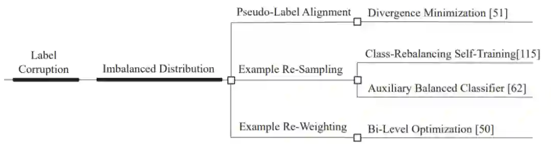 标签损坏 SSL方法假设无标签数据(未知)的标签分布是平衡的,即每个类中的示例数量几乎相等。然而,在许多现实场景中,训练数据的底层类分布是高度不平衡的。下图提供了用于标记损坏的健壮SSL方法的分类。如前所述,SSL中处理标签损坏问题的策略可以分为伪标签对齐方法、实例重权方法和实例重权方法。伪标签对齐方法的优点是,改进后的伪标签可以匹配到无标签数据的类分布的ground-真值,缺点是需要知道无标签数据类分布的ground-真值,这在实际任务中很难获得。另外,分布估计的精度对方法的性能影响很大。重权法和重抽样法是处理班级不平衡学习问题的经典方法。然而,在SSL任务中,由于它们不能直接根据标签重新采样或重新加权示例,因此它们需要比监督设置中更多的计算成本,原因是它们具有复杂的训练过程或难以实现的优化目标。