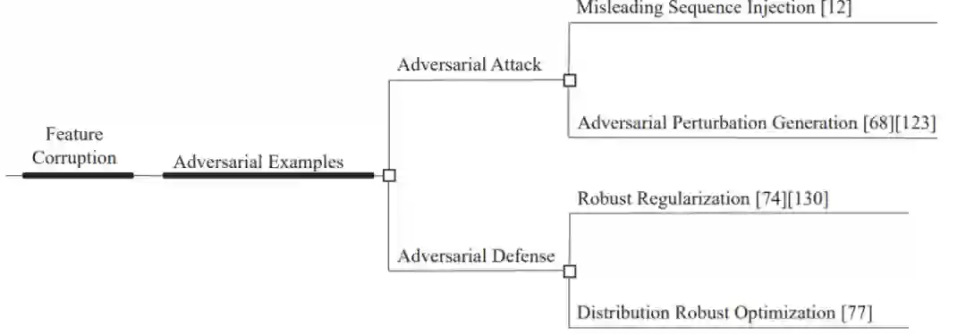特征损坏 特性损坏是指给定示例的特性被恶意干扰,从而导致学习到的模型对目标示例进行错误分类。下图提供了用于特性损坏的健壮SSL方法的分类。攻击技术主要有两种策略:误导性的序列注入和对抗性的扰动生成。所有这些方法都可以欺骗SSL模型,使其做出任何预期的错误预测。不同的是,误导序列注入在给定的训练数据中增加了新的训练样本,而扰动生成方法直接对给定的训练样本进行扰动。在防御技术方面,主要有两种策略:鲁棒正则化和分布鲁棒学习。由于鲁棒正则化方法直接在原损失函数中加入可微正则化项,因此相对于DRL方法,鲁棒正则化方法更易于优化。DRL的优点在于它具有良好的理论性质。