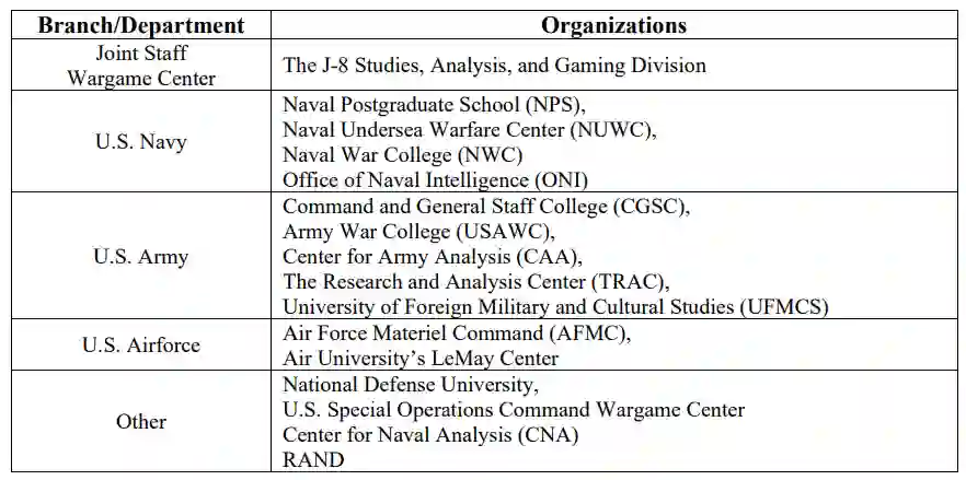 美国国防部(DOD)开发了各种模型和模拟,供各分支和部门使用。表 1 列出了国防部内使用模拟和兵棋的组织名单。这些工具通过不同的方法为指挥官的决策过程提供支持。采用的方法包括定制开发的软件;商业游戏的改编;研讨会、系统和混合等各种形式的战争游戏;以及电子表格的使用。每种模拟都是针对特定情况设计的,并为其所针对的特定梯队提供支持。因此,并非所有模拟都能实现定量战争迷雾(精确到足以用数字表示不确定性);有些模拟可能根本不包括战争迷雾,而有些模拟可能实现的战争迷雾过于宽泛。此外,即使实施了战争迷雾,由于需要大量启发式干预,其为指挥决策提供定量支持的效果也可能有限。