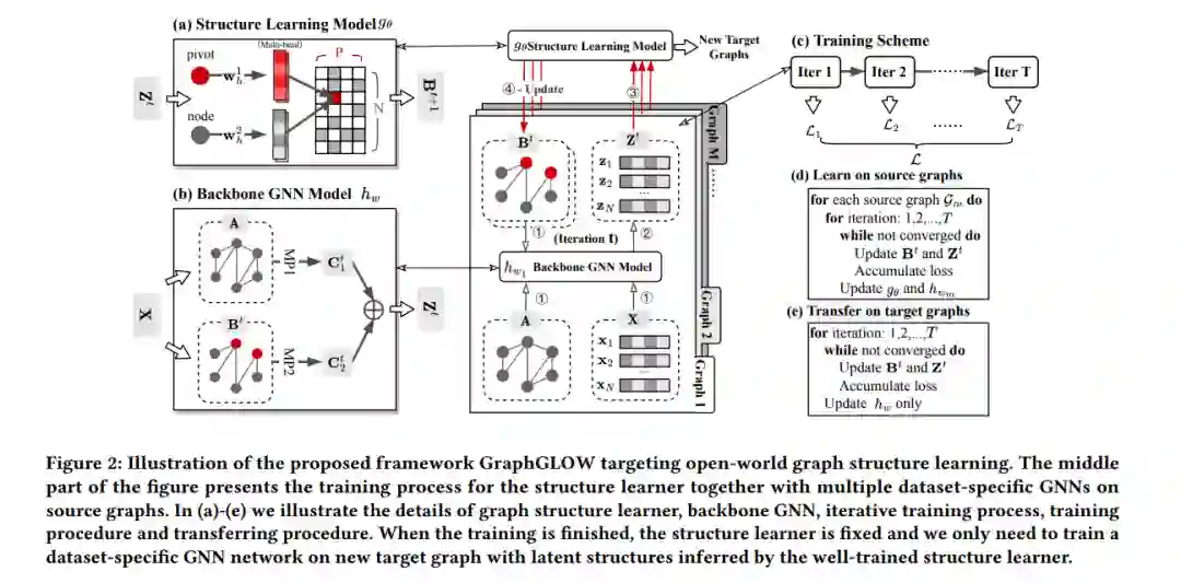 图结构学习是一个成熟的问题,旨在优化适应特定图数据集的图结构,以帮助消息传递神经网络(即GNN)产生有效且鲁棒的节点嵌入。然而,现有模型的普遍限制在于基本的封闭世界假设:测试图与训练图相同。这个前提要求对每个图数据集独立从头开始训练结构学习模型,导致计算成本过高,并可能出现严重的过拟合风险。为了缓解这些问题,本文探索了一个新的方向,即学习一个通用的结构学习模型,可以在开放世界中推广到各种图数据集。我们首先介绍这个新颖问题设置的数学定义,并从概率数据生成的角度描述模型的构建。然后,我们设计了一个通用框架,协调一个图共享的结构学习器和多个图特定的GNN,以捕捉跨数据集的可推广的最佳消息传递拓扑模式。经过良好训练的结构学习器可以直接为未见过的目标图生成适应性结构,而无需任何微调。在不同的数据集和各种具有挑战性的跨图泛化协议中,我们的实验证明,即使在目标图上没有进行训练,所提出的模型:i)显著优于在输入(非优化)拓扑上训练的表达能力强大的GNN;ii)令人惊讶地与独立优化特定目标图的最先进模型表现相当,并且在目标图上训练的速度明显加快了几个数量级。 https://arxiv.org/abs/2306.11264