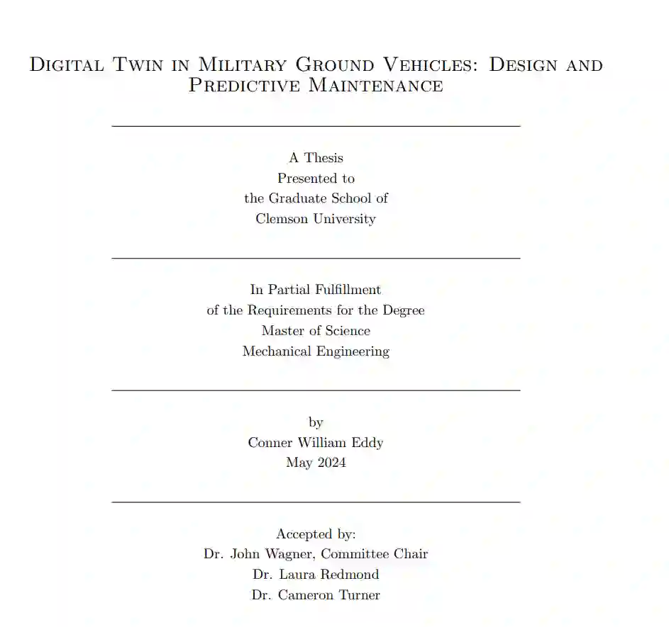 在该研究项目中,探索、开发了数字孪生技术,并将其应用于越野地面车辆的设计工程研究和预测性健康维护。研究目标包括将地面车辆部件的数学模型集成到数字孪生中,将数字孪生应用于车辆设计,研究预测性维护方法,以及创建两项调查,以衡量数字孪生技术的实用性和时间节省指标。通过在 MATLAB/Simulink/Simscape 中对轮式和履带式车辆进行建模,可以组装一个 14 自由度的虚拟车辆系统,该系统包括车身动力学、发动机曲线、车轮运动学、传动系统和悬挂特性,由虚拟驾驶员和环境输入进行驾驶。数字孪生工具为克莱姆森大学 VIPR-GS 中心的贸易空间分析研究提供了帮助。通过将 6 种异常情况播入虚拟模型,并利用基于神经网络的统计算法,将机器学习的预测性维护应用于越野数字孪生系统。在数值研究中,预测性维护框架利用了总共 275 次模拟中的 176 个记录信号,成功预测了 92% 的训练验证结果和 40% 的未测试复合异常的准确性。对克莱姆森大学国际汽车研究中心(CUICAR)校园内的 DO13/14 车辆工程团队进行了有用性和时间节省评估指标调查,结果显示数字孪生的有用性得到了积极的李克特量表响应,在模型组织和设计验证方面的优势最大。这些研究探索了数字孪生技术的优势和机遇,并在 VIPR-GS 中心进行了部署。鉴于人们对数字工程设计方法的认识不断提高,数字孪生代表着未来许多工作的基石。