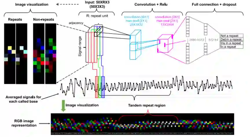 在将信号转换为彩色图像后,以下一般过程用于分配数据标签(“重复”或“不重复”或“重复删除”或“重复插入”) 图像将长reads的fastq序列与参考基因组(本研究中的GRCh38)对齐后,(i)如果一个核苷酸与任何重复区域的任何碱基对齐,则分配“重复” 以长读核苷酸为中心的图像;(ii)如果一个核苷酸是重复区域1bp的插入(删除),则“重复的插入”(“重复的删除”)被分配给t 他在长读取中以核苷酸为中心的图像;(iii)如果一个核苷酸被剪切或插入(较大的插入)从STR区域开始,或与非整数的STR区域对齐 ,图像没有标签构建(不用于训练或测试);(vi)对于不与任何STR区域对齐的长序列中的其他长reads核苷酸,用来构建图像标签“不重复”。