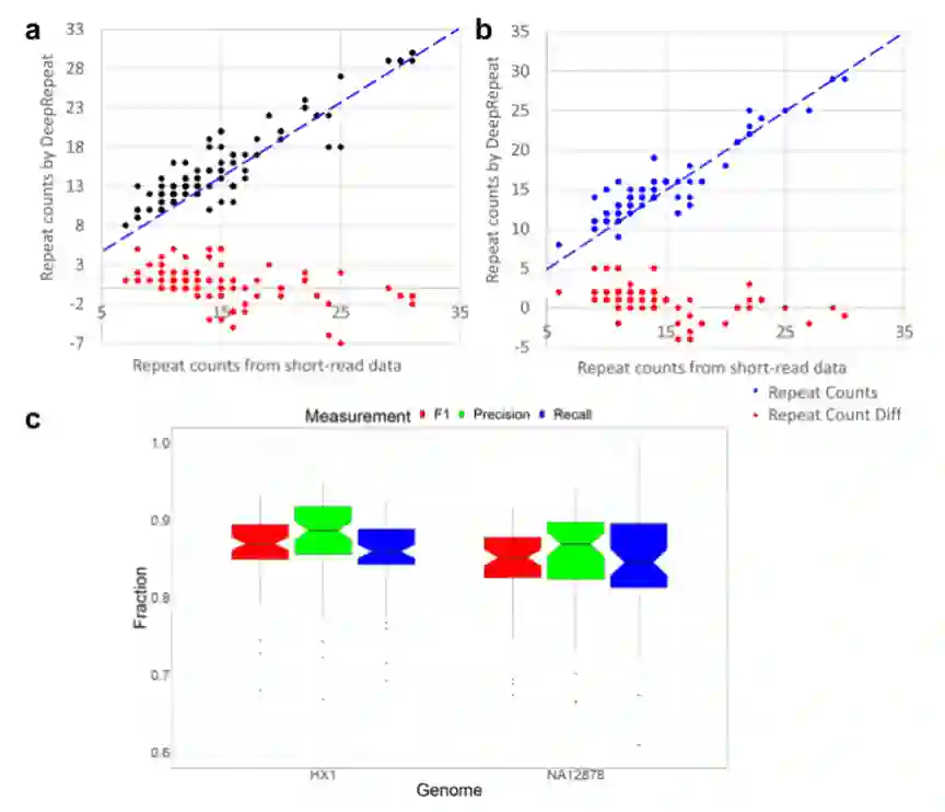 作者还测试了Deep Repeat在不同数据集上的迁移性能,同另一个工具HipSTR进行比较。如图3所示,a表示Deep Repeat在HX1上进行深度重复训练时,HipSTR在NA12878的高覆盖率短读数据进行重复计数,并对纳米孔数据进行重复推断, b表示通过Deep重复对纳米孔数据的重复计数,通过HipSTR对HX1的高覆盖率短读数据,而Deep重复在NA12878进行训练。通过DeepRepeat预测str-核苷酸的全基因组性能。“重复计数Dif”:Deep重复预测的计数减去HipSTR预测的相应计数。这表明,Deep Repeat在纳米孔数据上推断的大多数重复计数与从高覆盖率短读数据中估计的重复计数相似。
