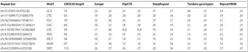 为了进一步评估DeepRepeat,作者选择了9个STR位点(fve三核苷酸STR和4个四核苷酸STR),对NA12878数据集进行Sanger测序,并测试了多个工具的性能,结果如图4所示。