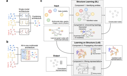 图2 多模态图学习蓝图概述。a,多模态学习的标准方法包括组合不同的单模态架构,每个架构针对不同的数据模态进行优化。b、相反,MGL框架中的一体化多模态架构考虑了端到端模型中每个数据模态的归纳偏差,从而实现了更具表现力的数据融合。c、MGL四个组件的路线图。即将实体识别、拓扑揭示、信息传播和表示混合学习组件集成到一体化多模态蓝图中。