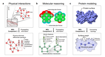 多模态图学习在自然科学中的应用。a、物理相互作用中的信息传播,其中,由于粒子间的相互作用和其他力,物理信息神经消息传递用于更新系统中粒子的状态。b,分子推理中的信息传播,使用全局注意机制来模拟两个分子中原子之间的潜在相互作用,以预测两个分子是否会发生反应。c,蛋白质建模中的拓扑发现,使用多尺度图表示将蛋白质的一级、二级和三级结构与分子超像素中总结的高级蛋白质基序集成,以表示蛋白质[27]。这种强大的拓扑结构为蛋白质-配体结合亲和力预测等任务提供了更好的预测。