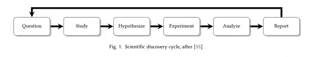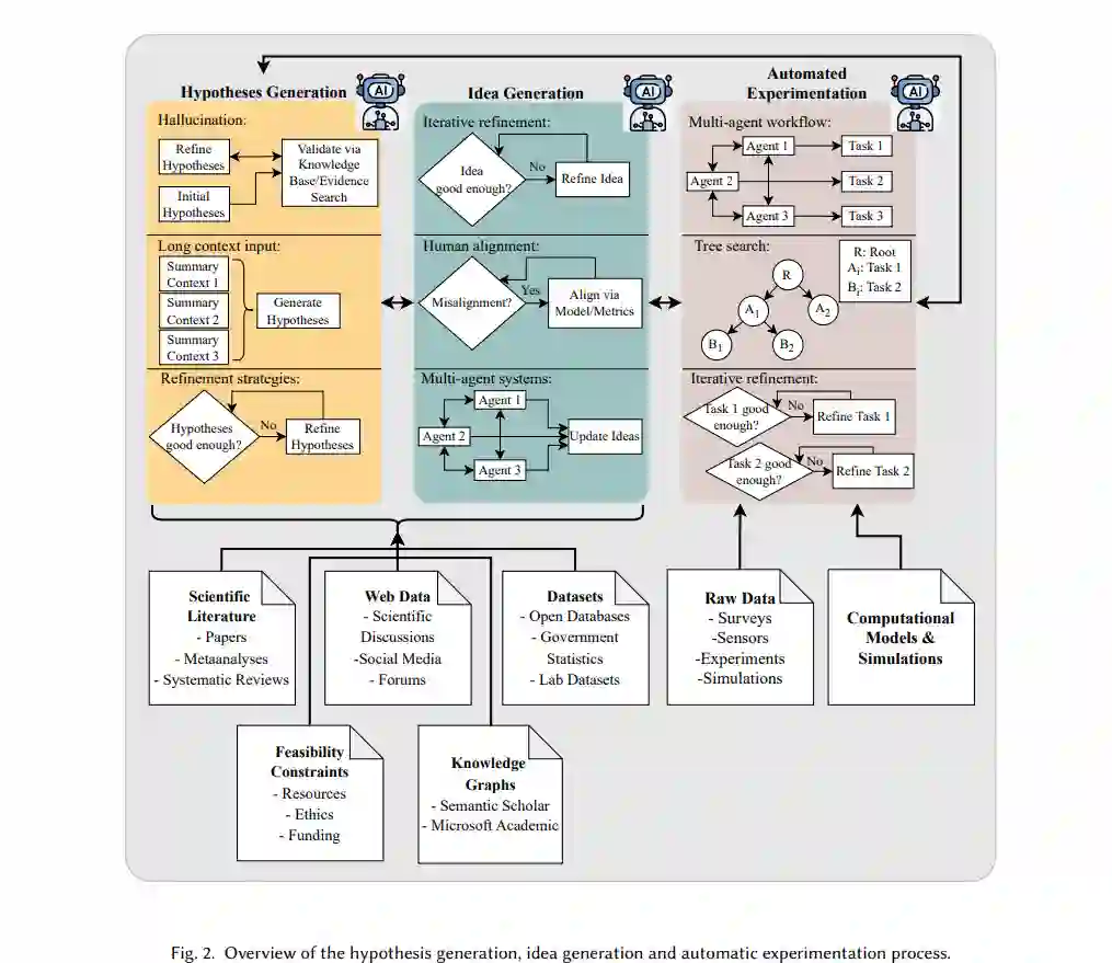 4.2 设计和进行实验;基于AI的发现假设生成、创意形成和实验是科学发现中的关键步骤。假设生成涉及提出具体且可验证的问题,这些问题为实证或理论的论证提供灵感;而创意形成,特别是在AI领域,侧重于提出新工具或对现有工具进行基准测试。实验则通过系统的观察、数据收集和分析来检验假设并评估创意。在AI中,这通常包括模型基准测试、运行仿真或进行消融研究。传统上,这些过程由人类研究人员完成。然而,在科学产出快速增长的时代,文献回顾到假设和创意形成的转变已变得非常耗时,尤其对于各学科的研究人员来说,鉴于他们在审阅日益增多的相关文献时的有限能力,这可能会阻碍科学进展。实验本身也引入了更多挑战,例如设计方法论、运行大规模仿真和分析结果。这些复杂性可能会减缓科学进展,尤其是在需要多次迭代以精炼实验结果时。最近,越来越多的研究开始关注大型语言模型(LLMs)在假设生成和创意形成中的潜力,因为LLMs能够高效处理和综合大量文献。除此之外,LLMs还可以与计算工具结合,支持自动化实验,在实验设计、仿真执行和结果分析中提供帮助。然后,基于这些发现,可以迭代地优化假设,形成反馈循环,从而加速发现过程。在本节中,我们将概述基于AI的假设生成、创意形成和实验过程。每个部分的回顾将集中在其数据集、方法、结果、局限性、伦理问题等方面。4.3 基于文本的内容生成在科学领域的基于文本的内容生成中,我们涵盖了生成科学论文特定文本部分的不同任务,例如自动生成:(i) 标题;(ii) 摘要;(iii) 相关工作部分;以及 (iv) 引用生成。此外,我们还将讨论使用AI系统进行的校对和释义重写,以及新闻稿生成。4.4 多模态内容生成与理解在科学领域,多模态内容生成指的是生成科学论文中的多模态科学内容,如图表和表格,或例如在发布后过程中的幻灯片和海报。通过AI自动化这些任务至少有三个重要原因:(i) 生成高质量的图表、表格、幻灯片和海报对于人类作者来说是困难且耗时的(维度:成本);(ii) 论文中高质量的多模态内容可以对引用或接受决策产生较大影响(维度:对作者的益处)[138];(iii) 表格、图形、海报和幻灯片使科学内容更容易被科学受众获取,并且通常代表了研究结果的简明表达(维度:对读者的益处)。多模态科学内容理解则指的是理解科学图像和表格(这通常需要推理过程),例如,回答有关多模态科学内容的问题,为科学图表和表格提供标题或总结。自动化这一理解过程有望实现自动描述这些多模态对象,这同样是耗时且成本高昂的工作,能够帮助读者更轻松地理解内容(例如,允许提出任何问题)。