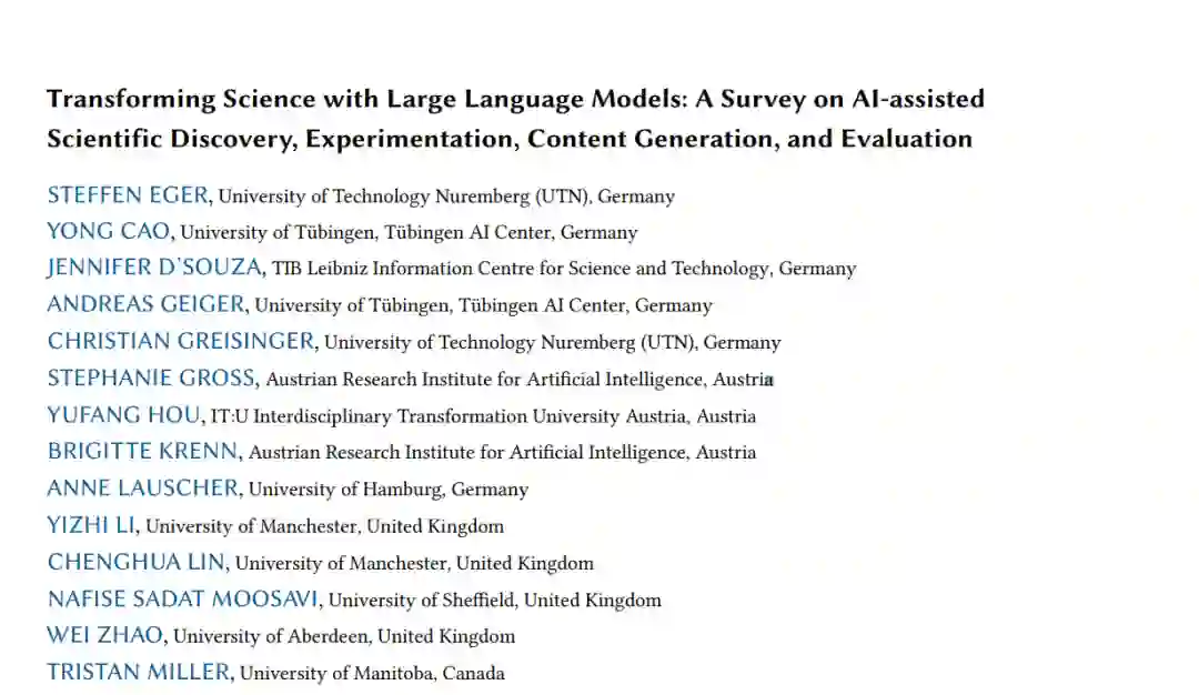 随着大型多模态语言模型的出现,科学正站在基于人工智能技术变革的门槛上。近期,涌现出大量新的人工智能模型和工具,承诺能够帮助全球的研究人员和学者更高效、更有效地开展研究。这些工具涵盖了研究周期的各个方面,尤其是:(1) 查找相关文献;(2) 生成研究想法并进行实验;(3) 生成基于文本的内容和(4) 多模态内容(例如,科学图表和图示);以及(5) 基于人工智能的自动同行评审。在本次调研中,我们深入探讨了这些令人兴奋的最新进展,它们有望从根本上改变科学研究过程。我们的调研涵盖了上述五个方面,提供了相关数据集、方法和结果(包括评估),以及局限性和未来研究的潜力。关于这些工具的不足之处及其潜在滥用(伪科学、剽窃、对研究诚信的危害)等伦理问题,特别是在我们的讨论中占据了重要位置。我们希望本次调研不仅能成为该领域新入者的参考指南,还能成为“AI4Science”领域中新的基于人工智能的创新举措的催化剂。 CCS概念: • 不要使用此代码 → 为您的论文生成正确的术语;为您的论文生成正确的术语;为您的论文生成正确的术语;为您的论文生成正确的术语。 附加关键词: 语言模型、科学、AI4Science、搜索、实验、创意生成、多模态内容生成、评估、同行评审 1. 引言