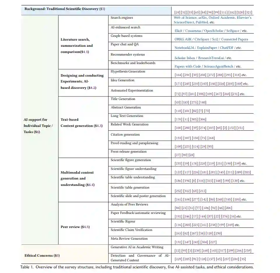 随着大型多模态基础模型的出现,如ChatGPT、Qwen、DeepSeek和Gemini等,许多研究领域和日常生活的各个领域正站在基于人工智能的技术变革的门槛上,科学也不例外。一项近期的研究分析了2018年到2024年间,约148,000篇来自22个非计算机科学领域的论文,这些论文引用了大型语言模型(LLMs),并报告了这些学科中LLMs的应用日益普及[202]。此外,美国出版公司Wiley最近对全球70多个国家近5000名研究人员进行的调查显示,尽管目前的AI应用主要限于写作辅助形式,但大多数研究人员认为AI将在未来两年内成为科学研究的主流。 传统上,科学依赖于人类的创造力和劳动来提出研究想法和假设、查找相关文献、进行实验并报告研究结果。然而,近年来,出现了大量承诺能够帮助科学家在这些任务中取得进展的AI模型、工具和功能。包括用于文献搜索的模型,如Elicit或ORKG ASK;用于实验设计的模型,如The AI Scientist [170];以及用于生成多模态科学内容的模型,如AutomaTikZ [18]和DeTikZify [19];甚至还有研究探讨这些AI模型在评估科学过程结果方面的能力,例如同行评审[302]。所有这些模型都承诺大幅加速科学研究周期,理想情况下能够带来意想不到的新发现,并为研究结果的文献编写、引用和报告提供更好的、更易用的、更准确的方式。 然而,据我们所知,目前还没有关于现有工具、模型和功能及其局限性的全面调查,能够帮助科学家加速和改进研究周期,除非是在社会科学[290]或物理学等特定子领域[310]。在本次调研中,我们填补了这一紧迫的空白,提供了关于研究周期五个核心方面的概述,在这些方面,最近出现了大量新的AI模型:第4.1节中的文献搜索(例如,查找相关文献)和内容摘要;第4.2节中的科学实验(例如,编程)和研究想法生成;第4.3节中的单模态内容生成,如草拟标题、摘要、建议引用和帮助重新表述基于文本的材料;第4.4节中的多模态内容生成与理解,如生成和理解图表、表格、幻灯片和海报;第4.5节中的AI辅助同行评审过程。Wiley的近期调查表明,这种概述对于AI研究人员在为科学过程提供更好的工具使用指南和支持方面具有重要意义,其中“63%的受访者表示,缺乏明确的指南和共识,关于在其领域中哪些AI用途被接受,和/或需要更多的培训和技能”。 在使用AI工具进行科学研究时,伦理问题至关重要。这是因为AI工具存在各种局限性,例如: (i) 它们可能产生幻觉并伪造内容;(ii) 它们可能存在偏见;(iii) 它们的推理能力可能有限;(iv) 有时缺乏适当的评估;(v) 它们可能具有较大的环境足迹,以及其他许多担忧,如伪科学、剽窃和缺乏人类权威的风险。事实上,欧盟最近发布了关于科学领域负责任使用AI的指南,指出,“研究是最可能受到生成式AI显著影响的领域之一”,“AI在加速科学发现、提高研究和验证过程的效率和进度方面具有巨大潜力”,“但这些[AI]工具可能危害研究诚信,并引发关于当前模型能否应对欺骗性科学实践和虚假信息的质疑”[5]。我们的调研对这些伦理问题给予了充分的重视,在我们覆盖的每个研究周期方面都包含了伦理关注部分,并且在第5节中有一个单独的“伦理问题”部分。 值得指出的是,我们的调研并未涵盖AI与科学关系的其他方面,例如,使用数据科学工具分析科学的研究,如“科学科学”的领域[76, 269]。 如表1所示,本文的其余部分组织结构如下:第2节讨论了我们调研的方法论;第3节简要概述了传统的科学发现与传播过程,这为第4节的内容提供了背景,第4节的每个子部分描述了AI在各个科学任务中的应用(文献搜索、实验设计、写作等)。对于每个任务,我们描述了重要的数据集、现有的先进方法和结果、伦理问题、应用领域、局限性以及未来的研究方向;第5节讨论了不特定于某个任务的伦理问题;最后,第6节总结了科学AI的优势与局限,并指出了一些未来研究的方向。 本次调研相关资源可在 https://github.com/NL2G/TransformingScienceLLMs 上访问。 2. 调查方法本文提供了一个高层次的、学科背景化的调查,涵盖了人工智能在科学研究实践中的最新应用,从研究想法的初步构想到结果的传播。它旨在帮助人工智能领域(自然语言处理、计算机视觉等)的研究人员快速熟悉这一广泛且快速发展的研究领域的跨学科基础和最新发展。部分内容对政策制定者、从业者和相邻领域的研究合作者也有用,包括人机交互、图书馆和信息科学、传播研究、元科学、科学新闻和研究伦理。尽管我们既不打算提供生产就绪工具的全面目录,也不打算提供使用这些工具的实用指南,但我们所涵盖的示例可以作为任何领域的研究人员将(辅助性)AI技术纳入其研究工作流程的起点。我们相信我们的贡献是及时的,因为尽管对该主题的兴趣日益增长,但其研究人员才刚刚开始形成一个拥有专门传播场所的社区。最近的例子包括2024年或2025年首次举办的Natural Scientific Language Processing and Research Knowledge Graphs (NSLP)(Miller et al., 2020)、Foundation Models for Science (FM4Science)6、AI & Scientific Discovery (AISD)7和Towards a Knowledge-grounded Scientific Research Lifecycle (AI4Research)8等研讨会。现有的AI-for-science文献综述仅涉及孤立主题或应用领域。最早的例子(例如(Bertrand et al., 2020; Bhattacharya et al., 2020))现在已经过时,往往组织成AI用于专门任务的案例研究,如方程或药物发现。最近的调查,如(Bartlett et al., 2020),涵盖了更广泛的应用领域,但集中在