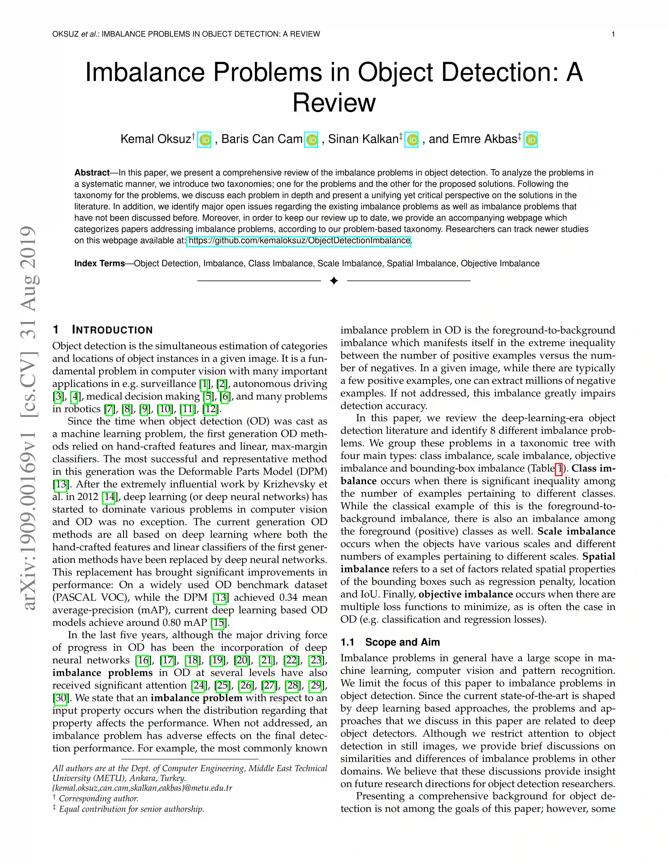 论文摘要: 在本文中,我们对物体检测中的不平衡问题进行了全面回顾。 为了系统地分析问题,我们引入了两种分类法; 一个解决问题,另一个解决方案。 按照问题的分类法,我们深入讨论每个问题,并对文献中的解决方案提出一个统一而又批判性的观点。 此外,我们确定了有关现有不平衡问题以及以前未讨论过的不平衡问题的主要开放问题。 此外,为了使我们的评论保持最新,我们提供了一个随附的网页。