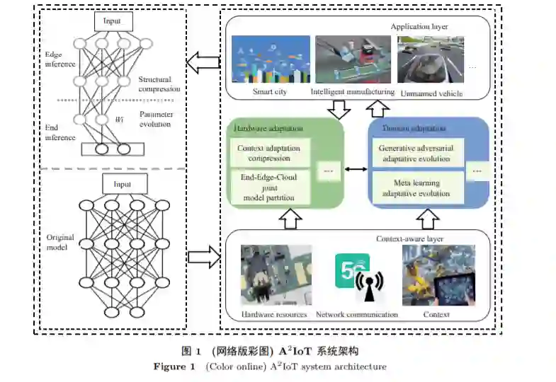 随着人工智能和物联网的快速发展与融合, 智能物联网AIoT 正成长为一个极具前景的新兴前 沿领域, 其中深度学习模型的终端运行是其主要特征之一. 针对智能物联网应用场景动态多样, 以及物联网终端 (智能手机、可穿戴及其他嵌入式设备等) 计算和存储资源受限等问题, 深度学习模型环境自适应正成为一种新的模型演化方式. 其旨在确保适当性能的条件下, 能自适应地根据环境变化动态调 整模型, 从而降低资源消耗、提高运算效率. 具体来说, 它需要主动感知环境、任务性能需求和平台资源约束等动态需求, 进而通过终端模型的自适应压缩、云边端模型分割、领域自适应等方法, 实现深度学习模型对终端环境的动态自适应和持续演化. 本文围绕深度学习模型自适应问题, 从其概念、系统架构、研究挑战与关键技术等不同方面进行阐述和讨论, 并介绍我们在这方面的研究实践.