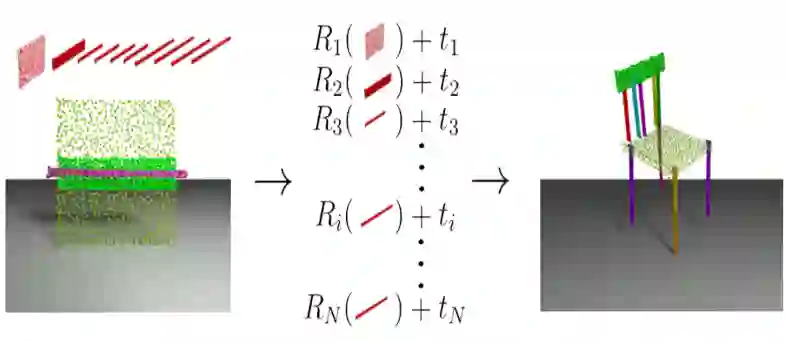 三维形状的部件拼装,是计算机视觉、图形学领域的基本问题。如图1所示,三维部件拼装在数学上可以形式化为对于各个输入部件的位姿估计(pose estimation)问题,即给定各个部件在各自规范空间(canonical space)中的布局,目标是组成一个完整的形状。三维部件拼装有着很广泛的应用,比如从家具城买回来一堆家具的部件,或者工厂当中有一堆杂乱摆放的零件,这时候则需要机器人把这些零散的部件组装成完整的、可供使用的整体。