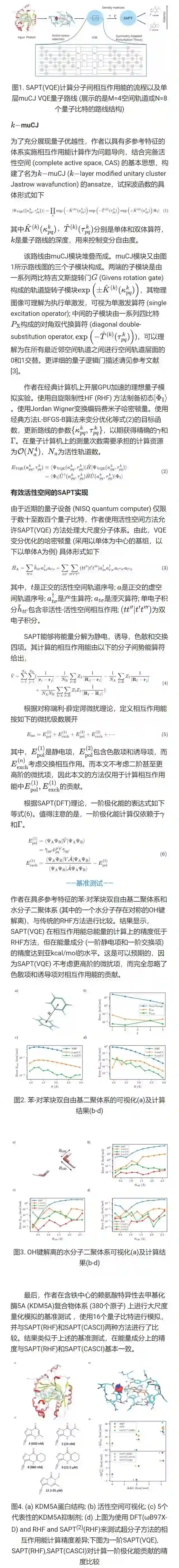 **——背景——****如何在大尺度的生物分子体系中应用量子化学方法进行准确、快速的计算是长期以来极具挑战性的问题。随着Google Quantum AI近些年来在量子化学模拟上展现的量子优势,基于量子计算机的量子模拟在近些年来已经成为量子化学面向大尺度体系高性能计算最有希望的领域之一。针对这一挑战,QC Ware和勃林格殷格翰(Boehringer-Ingelheim) 在今年一月于Chem. Sci. 联合发表题为"Towards the simulation of large scale protein-ligand interactions on NISQ-era quantum computers"的文章,发展了一套在蛋白-配体复合物体系中计算相互作用能的经典-量子混合方法。作者之一的Robert M. Parrish,是著名的量子化学开源程序Psi4的开发者之一,从佐治亚理工学院David Sherrill组毕业后,在QC Ware公司担任化学模拟研究方向的带头人。——方法——******本文尝试利用量子计算机来突破目前电子结构理论难以广泛应用于大尺度生物分子体系的困境。由此,作者开发了SAPT(VQE)方法,其流程 (如图1所示) 大致可以分为: 1) 预处理步骤: 使用量子算法VQE (variational quantum eigensolver) 获取活性空间 (可简单地看作是配体结合位点) 精确的一阶和二阶约化密度矩阵