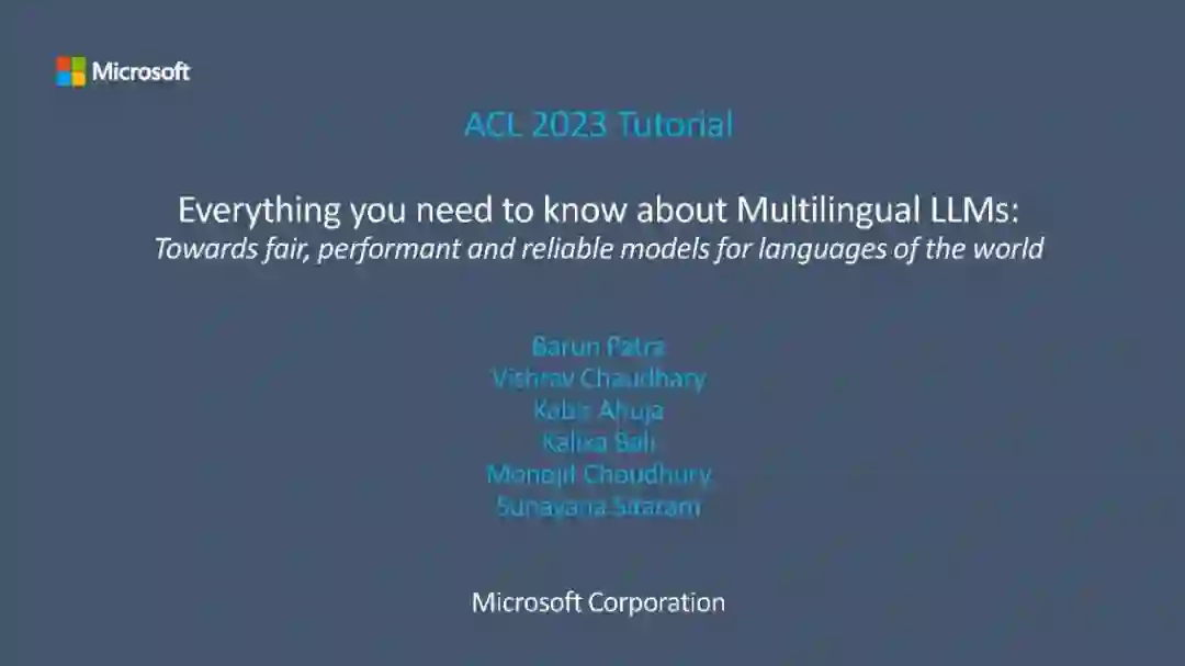 本教程将通过介绍大规模多语言模型(MMLM)的最新研究,描述将语言技术扩展到世界上许多语言的各个方面。我们将涵盖数据收集、模型训练和微调等主题,负责任的人工智能问题,如公平、偏见和毒性,MMLMs背景下的语言多样性和评估,特别是关注非英语和低资源语言的问题。此外,我们还将讨论在该领域的语言社区中部署这些模型时的一些现实世界挑战。