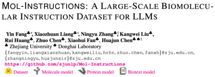 **论文题目:**Mol-Instructions: A Large-Scale Biomolecular Instruction Dataset for Large Language Models **本文作者:**方尹、梁孝转、张宁豫、刘康为、黄睿、陈卓、范骁辉、陈华钧(浙江大学)
