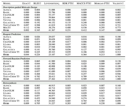 为评估Mol-Instructions对大型语言模型(LLMs)在理解和预测生物分子方面的助益,本文对LLaMA-7B模型进行了指令微调,并从多个角度进行了定量实验分析。实验结果显示,经Mol-Instructions微调的LLM在多种任务上的表现超越了其他大型模型,证明了Mol-Instructions在提升LLMs处理生物分子信息能力方面的关键作用。然而,由于轻量微调过程的局限性,经过微调的LLM在分子生成任务上的表现并未超越现有的专用小型模型。这反映了LLM在追求广泛任务处理能力时,可能会牺牲掉某些专用小模型的专业性。