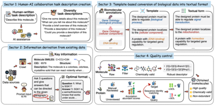 图(a-d)揭示了分子的多维特征。Bertz复杂度是评估分子复杂度的关键指标。分子量反映了分子的大小和复杂性,对众多化学反应具有决定性影响。原子计数揭示了分子的规模和复杂度,进而影响其稳定性和反应性。环计数则提供了结构复杂度和潜在稳定性的视角,对理解化学反应性和生物活性潜力至关重要。图(e-j)探究了蛋白质的特性。图(e-g)体现了蛋白质序列长度的不同分布。根据NCBI分类,这些蛋白质覆盖了丰富的物种和实验菌株,包括13,563个蛋白质家族和643个超家族。图(h-j)关注功能特征,如结构域、基因本体和催化活性的注释。这些数据表现出显著的长尾分布,凸显了推断特定蛋白质功能的挑战,尤其是那些罕见功能的蛋白质。 * 如表格所示,分子设计和蛋白质设计的文本描述提供了多维度的视角,涵盖从基本属性到特定应用场景的广泛特性。